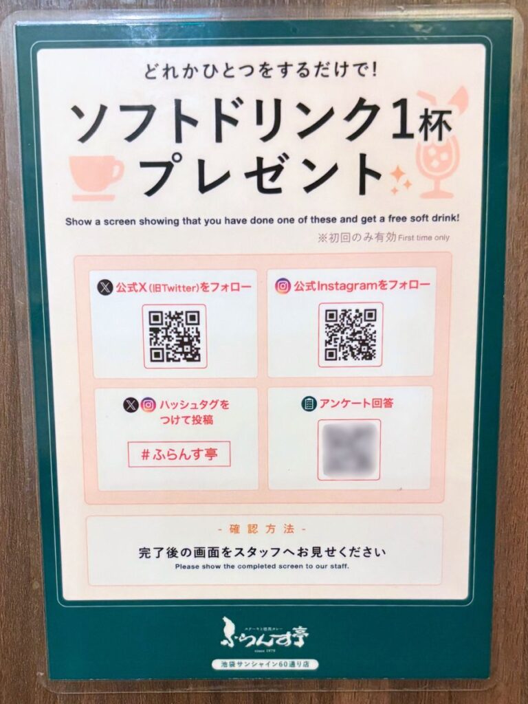 店内に掲示されているQRコードから、公式Xやインスタをフォロー、ハッシュタグをつけて投稿、アンケートに回答のいずれかで、ソフトドリンクが1杯無料になりました。